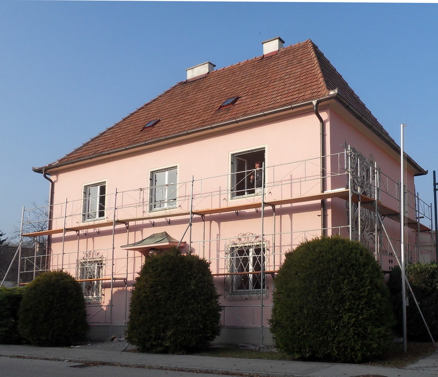 Am 24. Mai war der Abbruch des alten Pfarrhofes beendet. Nun wurde mit dem Ausmessen des Kellers und mit dem Betonieren der Grundfeste begonnen. Zunächst waren nur zwei, später drei und zeitweise vier Maurer zur Arbeit. Handlanger dieser sowie das Kalkablöschen und Mörtelmischen wurde von freiwilligen Helfern durchgeführt. Zum Betonieren wurde Schotter aus der Schottergrube in Kollersdorf von freiwilligen Helfern herbeigebracht. Am 5. Juni war die Grundfeste fertiggestellt und es konnte mit den Grundmauern begonnen werden. Dazu wurde nur gutes Ziegelmaterial verwendet. Außen- und Innenmauern des ebenerdigen Traktes waren mit 26. Juni fertig. Zimmerleute der Fa. Hametner aus Altenwörth legten den Tramboden und machten die Verschalung. Das Mauerwerk des 1. Stockwerkes wurde mit Hohlblock-Ziegeln hergestellt. Mittels elektrischen Aufzuges wurden die Ziegel und Mörtel hochgezogen. Bereits am 11. Juli ist die Gleiche fertig und an der SO-Ecke des Baues prangte der geschmückte Baumgipfel. In den kommenden Tagen legten die Zimmerleute die Decke im Obergeschoß. Am 16. Juli war der Dachstuhl aufgesetzt, am Abend bereits (eingelagert) eingelattet und auch der geschmückte Firstbaum fehlte nicht. Nun wurden die Rauchfänge aufgemauert. Am 24. Juli konnten die Dachziegel eingehängt werden. Ein Dachdecker und 38 freiwillige Arbeitskräfte waren zu dieser Arbeit erschienen. Altenwörth stellte 16, Gigging 6, Kollersdorf 11, Sachsendorf 5 Leute. Aus Winkl war niemand erschienen. Innerhalb von 4 ½ Stunden war die Arbeit vollbracht. So stand nach etwa 2 ½ Monaten der Rohbau fertig da. Nun begannen die Arbeiten im Innern des Hauses. Schon vorher hatten die Elektriker die Leitungen fürs Licht gelegt. Spenglerarbeiten durchgeführt durch Spenglermeister Zimmermann aus Fels, Dachdecker (Ziehensag aus Grafenwörth). Von den Maurern wurden Tür- und Fensterstöcke eingemauert, noch kleine Zwischenmauern aufgestellt, die Zimmerdecken angerohrt, Decken und Wände angeworfen und geputzt, Ein großes Glasfenster an der Nordseite eingesetzt, die Kanalisierung angelegt, der Dachboden wurde mit Lösch angeschüttet und betoniert. Von den Schlossern (Fa. Kitzler aus Kirchberg) wurden die Installierungsarbeiten für die Wasserleitung hergestellt, Wasserpumpe und Druckkessel aufgestellt. Die Fußböden (Fa. Hametner, Altenwörth) wurden gelegt, die Türstöcke für Ein- und Ausgang eingemauert. Sämtliche Tischlerarbeiten besorgte Tischlermeister Walter Magerl aus Kollersdorf. Mit 31. Oktober wurden die Maurerarbeiten somit fertig; der Außenputz wird erst im kommenden Frühjahr gemacht. Aber auch im Winter ruhte die Arbeit nicht. Pflasterer (Fa. Damböck. Kirchberg) und Fliesenleger (Felsner, Jettsdorf) waren beschäftigt, Elektriker (Ing. Knofel, Altenwörth) zogen die Leitungsdrähte ein, montierten Schalter und Stecker, Installateure bauten Waschmuschel und Speicher auf. Der Stiegenbauer (Kramer, Rosenburg) machte den Aufgang in den 1. Stock, Holzverschalung und Wandverkleidungen wurden hergestellt. Mit Anfang April 1958 wurden bereits die Malerarbeiten (Klug, Kirchberg) begonnen und am 15. April der Außenputz in Angriff genommen. Maurer, Maler-Anstreicher und Steinmetz (Müller, Krems) waren noch mit der weiteren Ausstattung beschäftigt. Zum Abschluß wurde noch durch Herrn Prof. Rudolf Pleban, akademischer Maler aus Tullnerbach, das prachtvolle Sgraffito-Bild an der Ostwand des Gebäudes, darstellend den Sturm auf dem Meere ausgeführt. Nachdem im Hofraum noch Betonwege angelegt, die Toreinfahrt hergerichtet und mit einem Blechsaum überdacht sowie rings um das Haus Traufenpflaster gemacht wurde, waren am 16. Mai 1958 sämtliche Arbeiten vollendet.