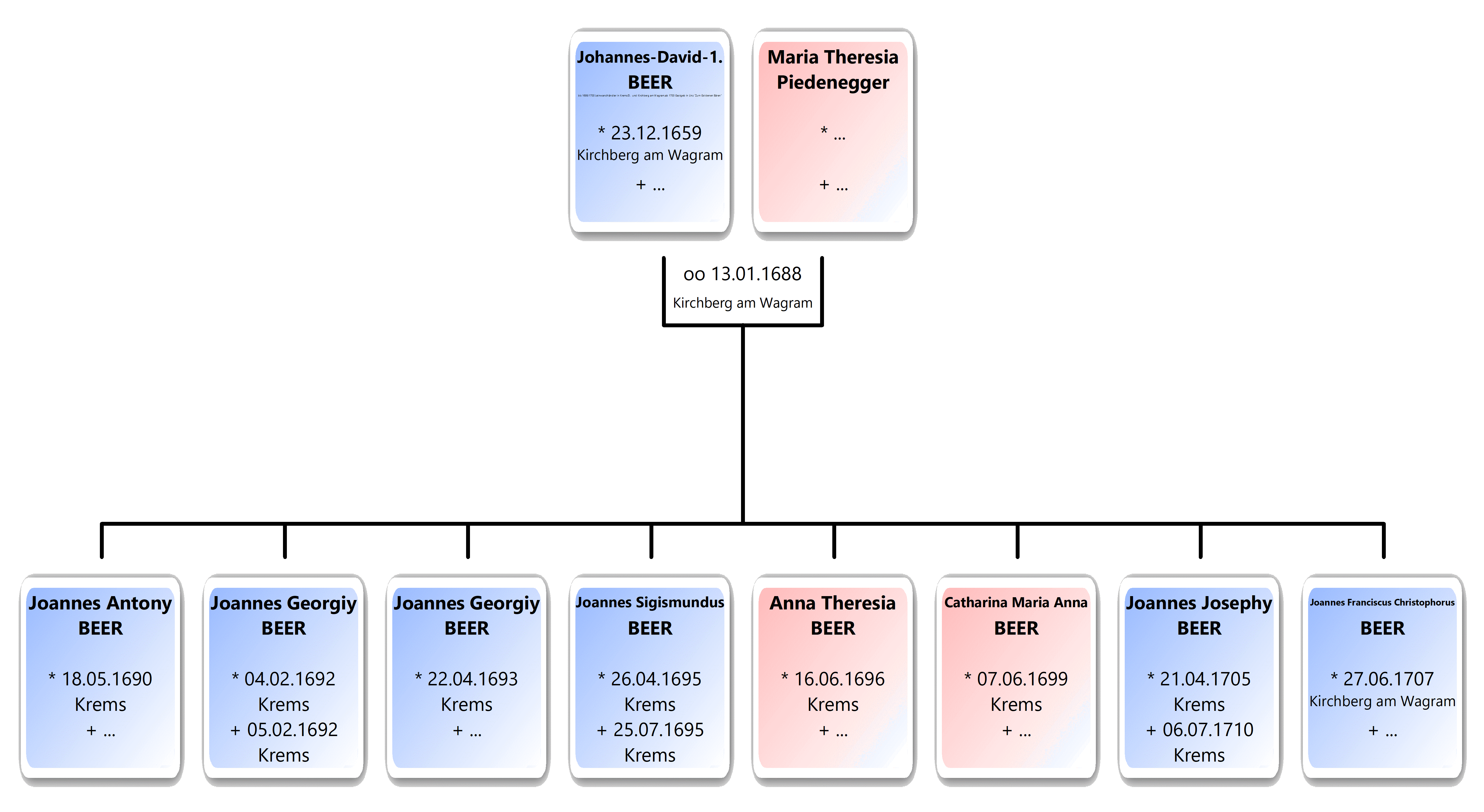 https://data.matricula-online.eu/de/oesterreich/wien/kirchberg-am-wagram/01%252C2%252C3-05/?pg=482 tom 02-05/49 17301 5.08.: Bräutigam: BEER Philipp, eh. Sohn des Franz Beer aus Unterstockstall und Eva ux.; Braut: WILDINGER Eva, eh. Tochter d. Joannes Wildinger und Maria ux. https://data.matricula-online.eu/de/oesterreich/wien/kirchberg-am-wagram/01%252C2%252C3-04/?pg=82 tom 01-04/78 1703 18.09.: *~ Eva Rosina fil. legit. Johann Wildinger, Hawer von Königsbrunn ux. Justina, Patr. Maria Elisabetha Seitzenbacherin? von d. Newstüfft; Min. Johann Sartori Capellany.
