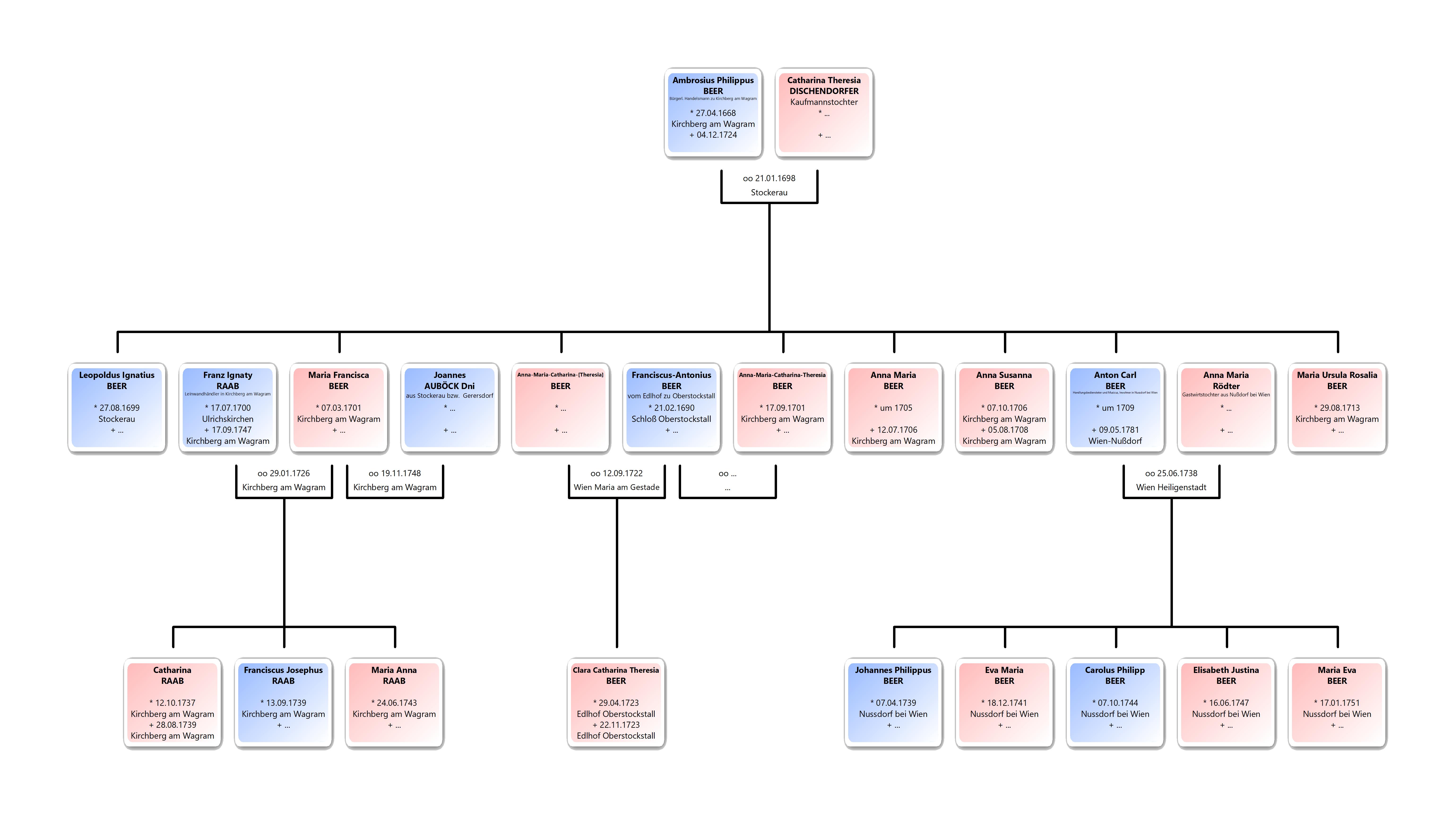 https://data.matricula-online.eu/en/oesterreich/wien/19-heiligenstadt/02-04/?pg=49 tom 02-04/45 1738 25.06. Cop, Snt. der ehrngeachte Hr. und Jungegesöll Anton Carl Beer, Handlungsbediender in Wienn, des Ehrngeachten Herrn Philipp Ambrosius Beer Leinwath Handler zu Kirchberg am Wagramb, Theresia dessen Ehefrauen beede seel. ehelich erzeigter Hr. Sohn, ꝏ mit der vill Ehr- und tugendreichen Jungfrau Anna Maria Rödterin, des Ehrn geachten Hr. Sebastian Rödter, Würdt und Gastgöb zum Weissen Crügl zu Nusdorff so noch in Löben, Elisabeth dessen Ehewürthin seel. beeder ehelich erzeigten Jungfrau Tochter.
