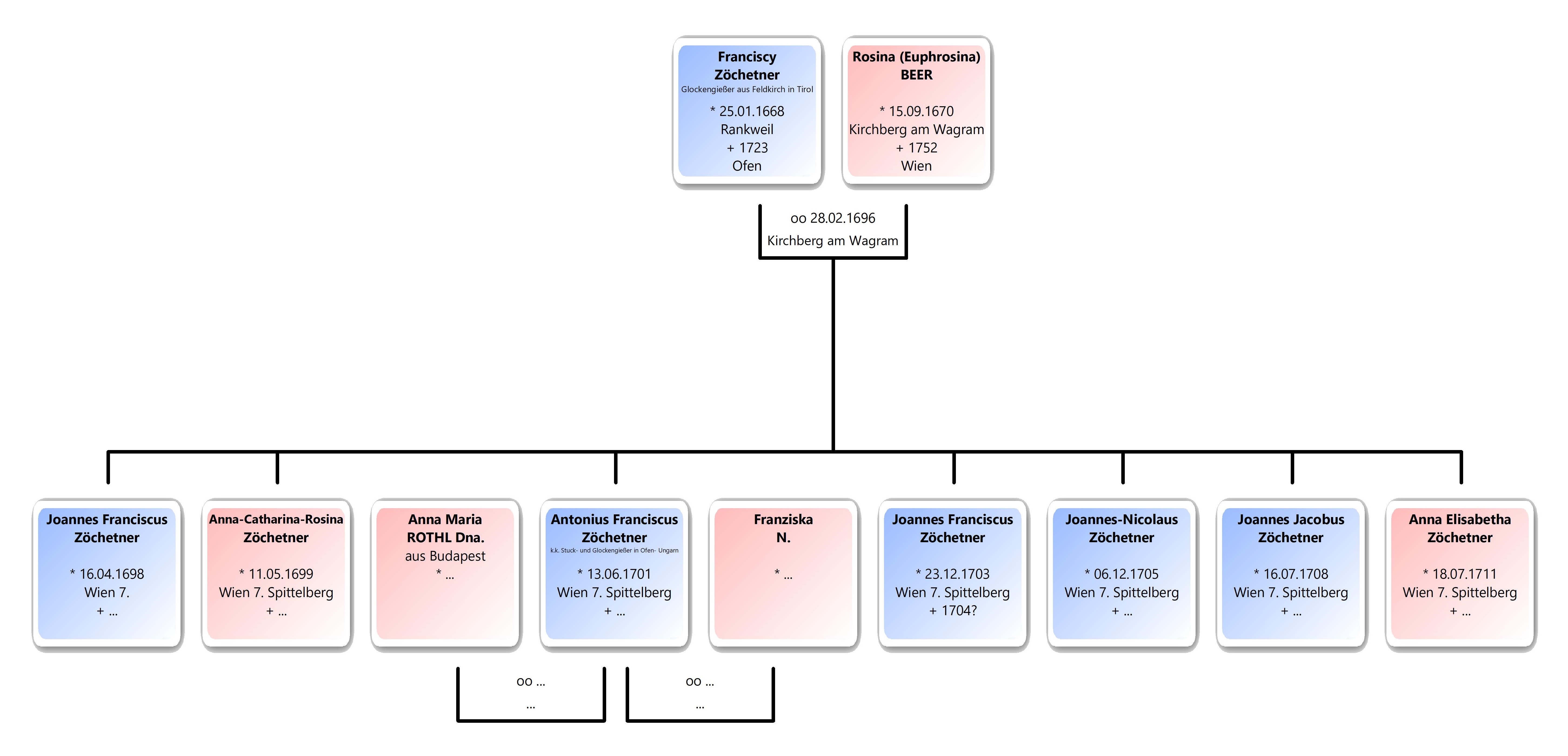 A.-II.A.-I.A.-I.B.-I.F. Eva Rosina (Euphrosina), Nob. *~ 15.Sept. 1670, + 1752 in Wien oo 1696 28.02. Franciscy ZÖCHETNER (ZECHETNER, ZEHETNER), „Glockengiesser aus Feldkirch in Tyrol“, *~ 1688 25.01., + 1723 in Ofen (Budapest). [25]