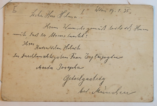 I. k.k. die durchl. Frau Erzherzogin Maria Josepha hat sich sehr gefreut durch Herrn Dr. Kernmeyer von Ihnen zu hören, u. beauftragt mich Ihnen beigeschlossene Karte zu übersenden, die das Bild der kleinen Villa in Hirschgasteig bei München zeigt welche höchstdieselbe derzeit bewohnt.